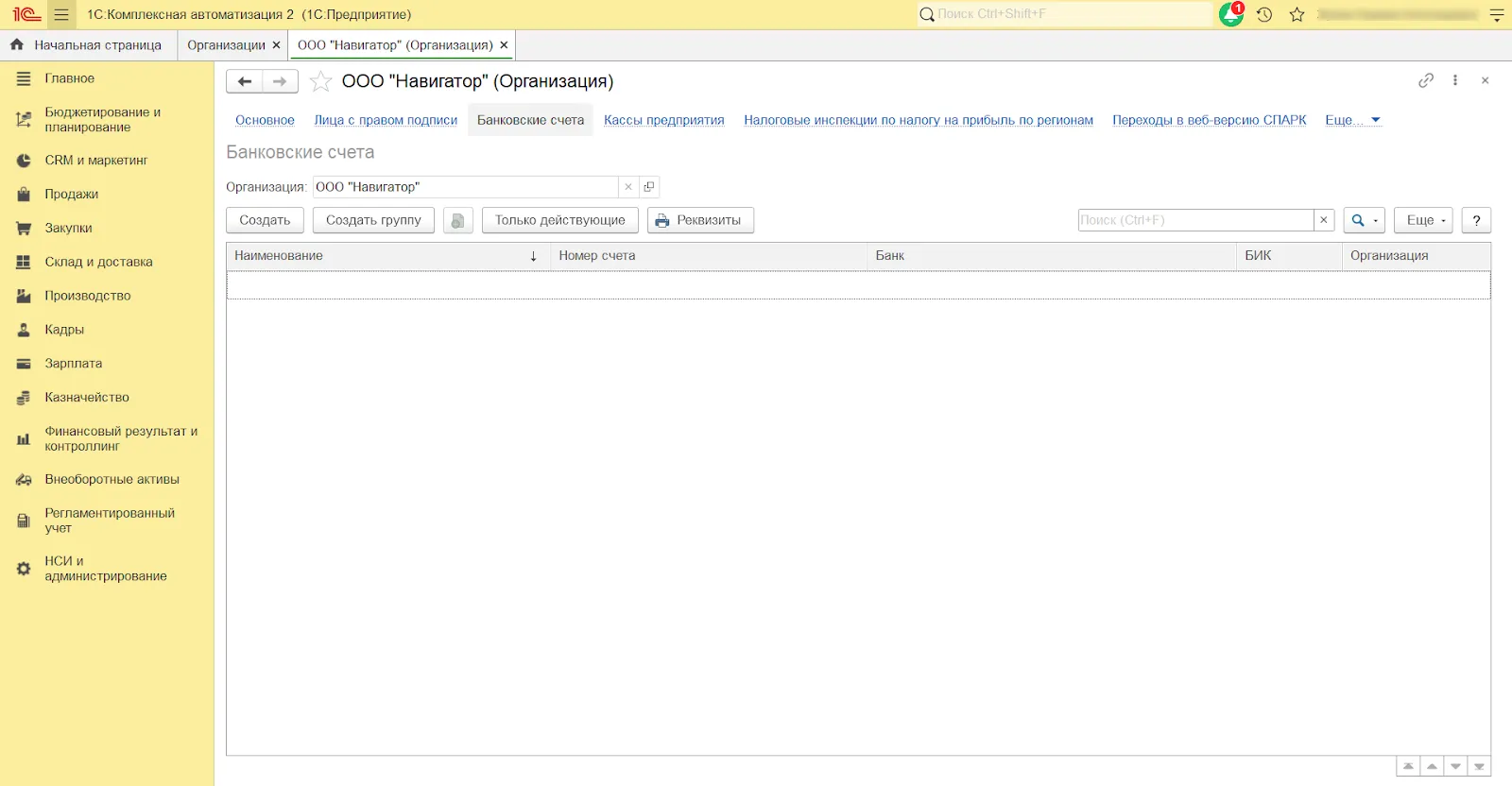 2. Выберите нужную организацию и переключитесь на вкладку «Банковские счета» — «Создать».