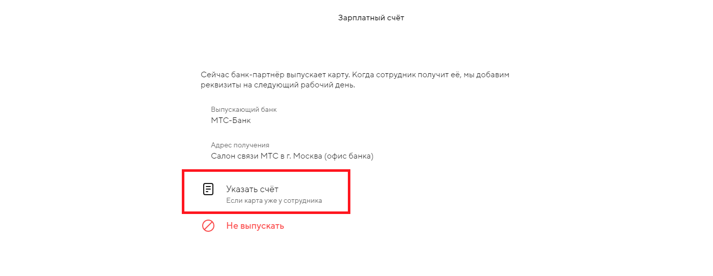 ШАГ 1. Когда сотрудник получил карту партнёров, на следующий рабочий день в вашем Зарплатном проекте появятся её реквизиты и можно будет выплачивать зарплату. Пока статус не обновится, платить сотруднику нельзя.