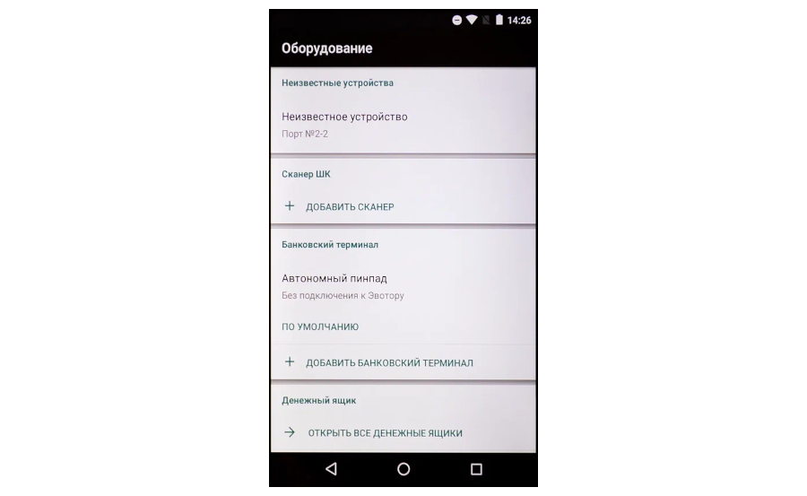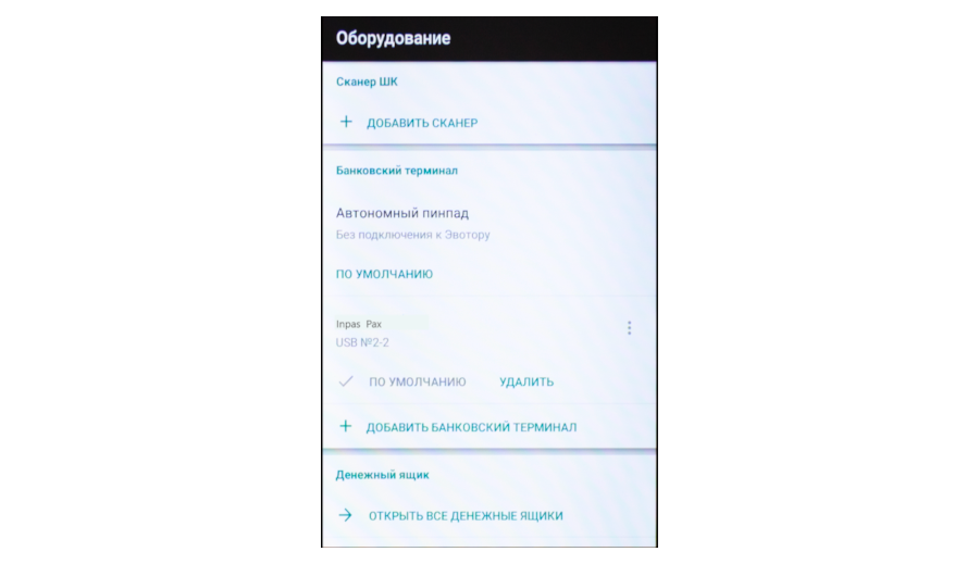 ШАГ 3. Добавьте в настройках кассы подключенный терминал: на главном экране кассы выберите пункт «Настройки» — «Оборудование» — «+ Добавить банковский терминал» — «InpasPAX».