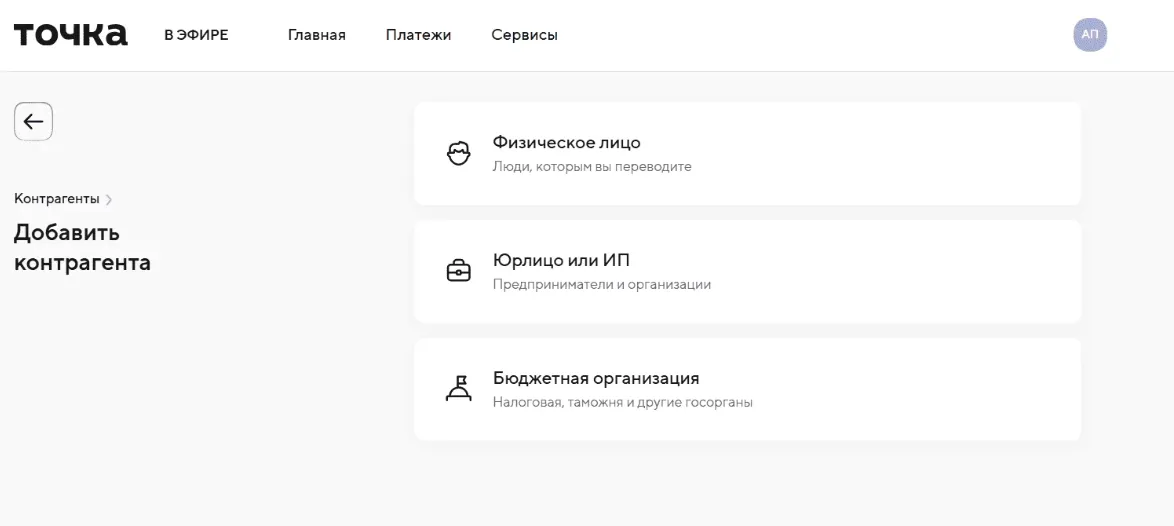 В списке контрагентов нажмите «Добавить контрагента».