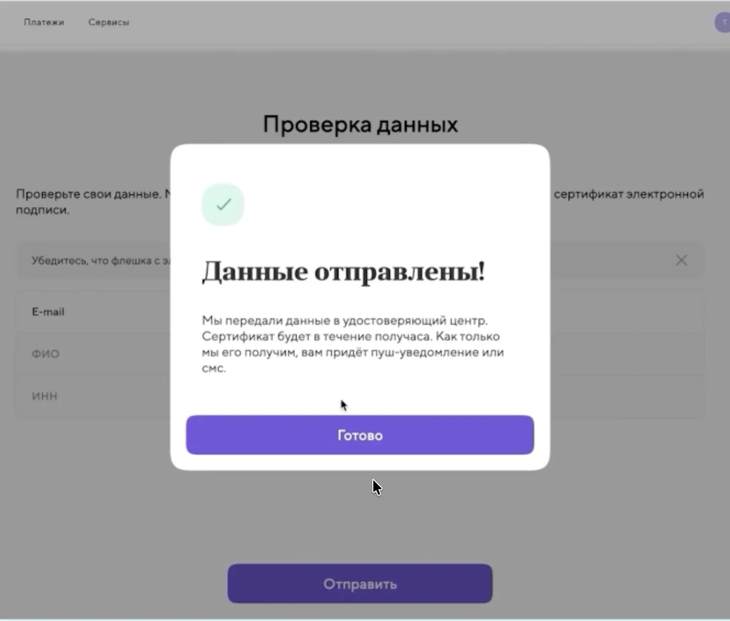 10. Поздравляем! Этап отправки данных завершён, осталось дождаться обратной связи от УЦ.