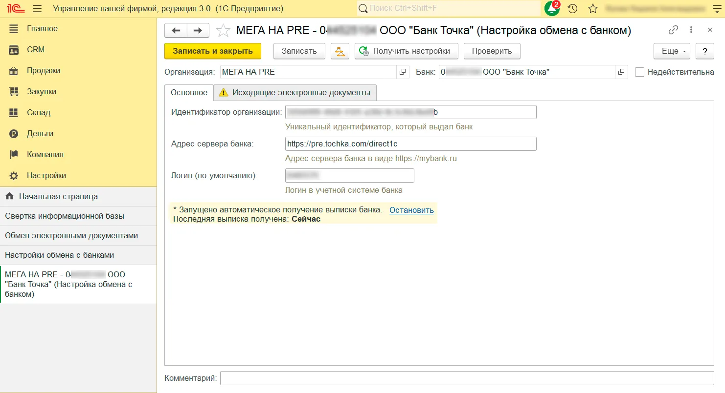 1. Откройте 1С и в меню слева перейдите в раздел «Настройки» — «Интеграции» — «Обмен с банками».