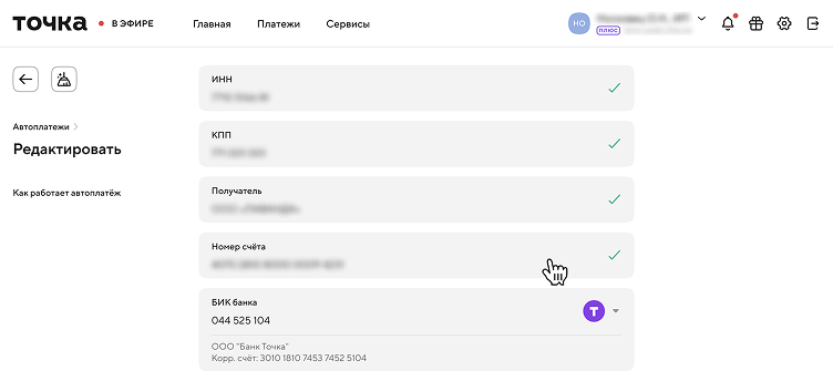 Чтобы настроить автоплатёж на свой счёт или фонд в Точка Банке, перейдите к созданию автоплатежа и укажите в реквизитах получателя данные своего счёта.