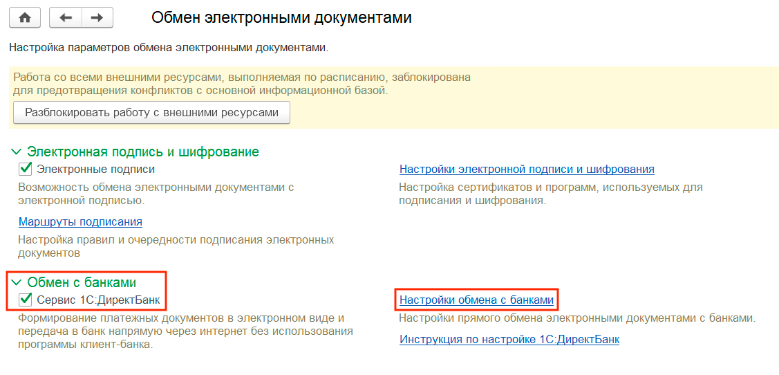 5. Выберите пункт «Обмен с банками» и поставьте галочку напротив «1С:ДиректБанк». Затем откройте раздел «Настройки обмена с банками».