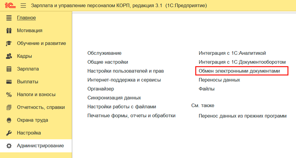 4. В 1С перейдите в раздел «Администрирование» — «Обмен электронными документами».