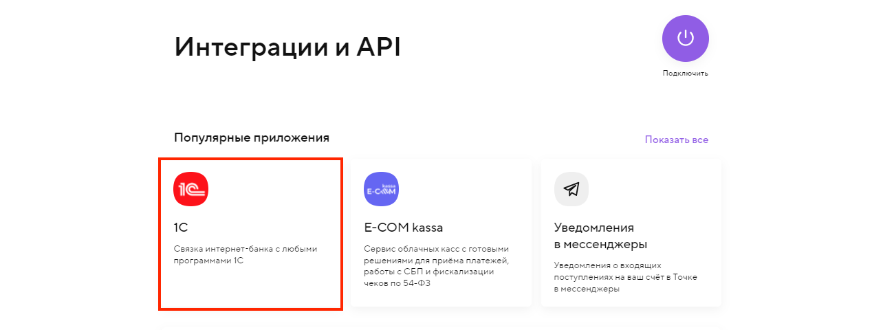 2. Выберите интеграцию с 1С и создайте новый доступ по нашей инструкции. Если пользователь уже есть в сервисе, переходите к следующему пункту.