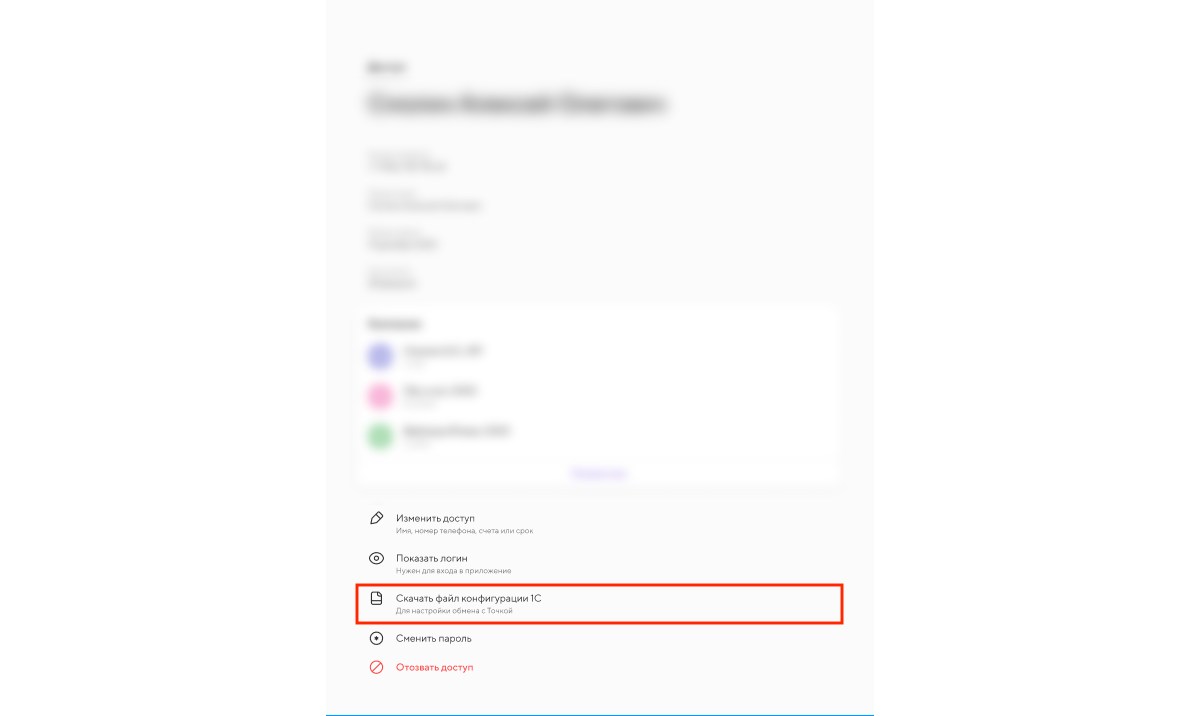 3. Выберите нужного пользователя в списке доступов и нажмите «Скачать файл конфигурации 1С».