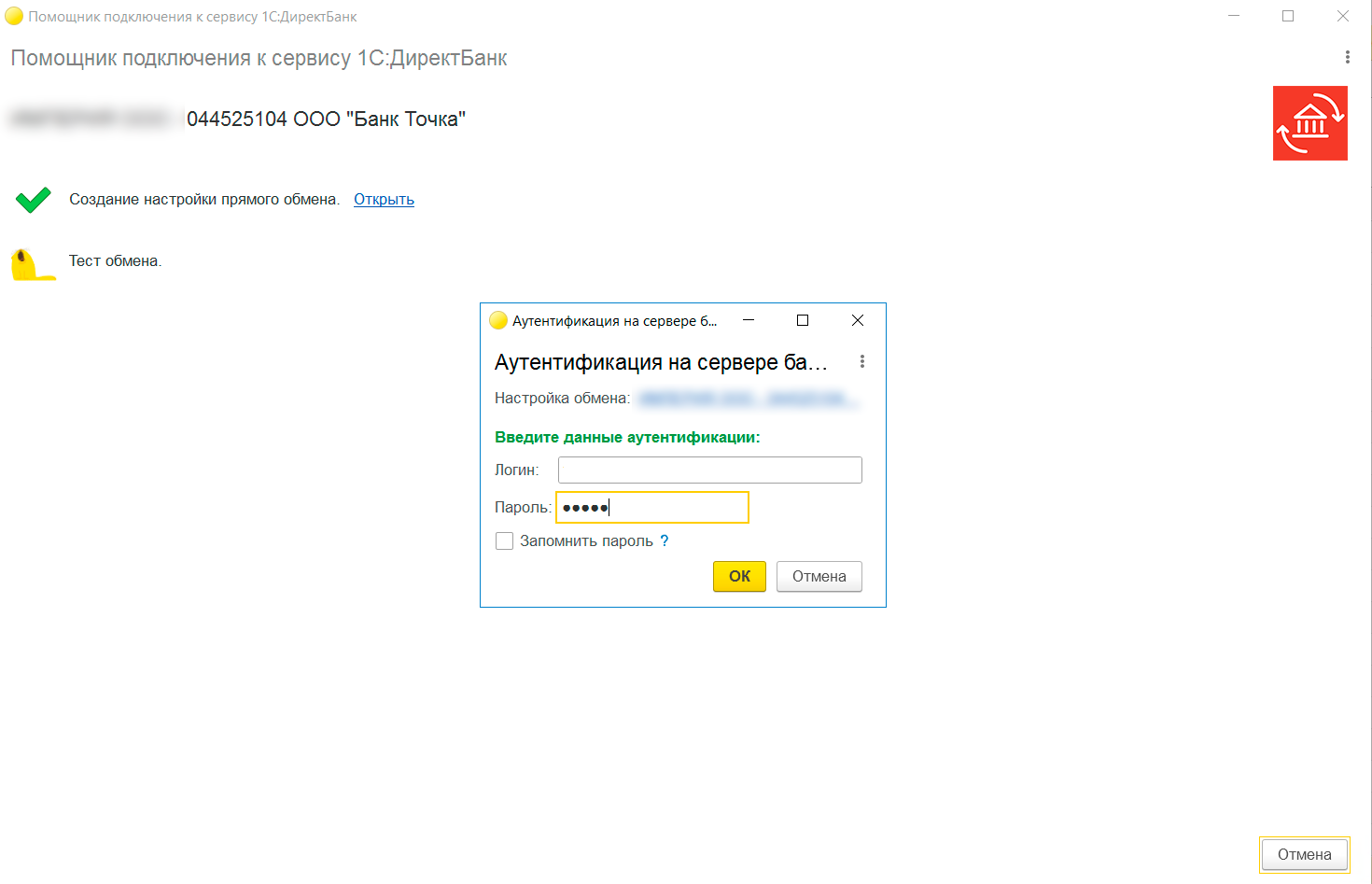 8. В новом окне введите логин и пароль от интеграции с 1С, вы уже получили их в смс. Нажмите «ОК».