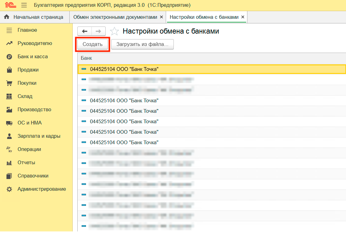 2. Выберите пункт «Обмен с банками» и поставьте галочку напротив «1С:ДиректБанк». Затем откройте раздел «Настройки обмена с банками».