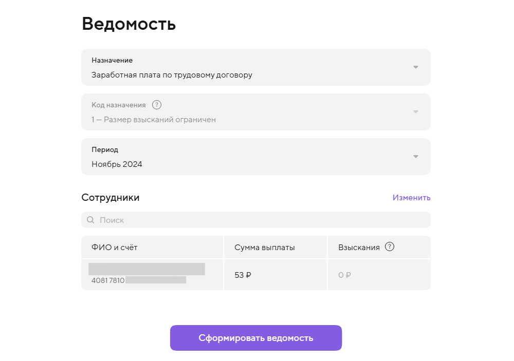 ШАГ 2. На следующем этапе нужно заполнить ведомость. Укажите назначение, период и суммы выплат сотрудникам, а затем нажмите «Сформировать ведомость».