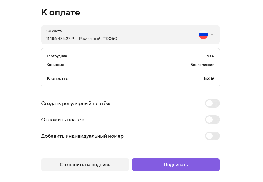 ШАГ 3. Укажите счёт списания, проверьте сумму и выберите дополнительные настройки ведомости, если это необходимо. Затем нажмите «Подписать» и подтвердите оплату смс-кодом.