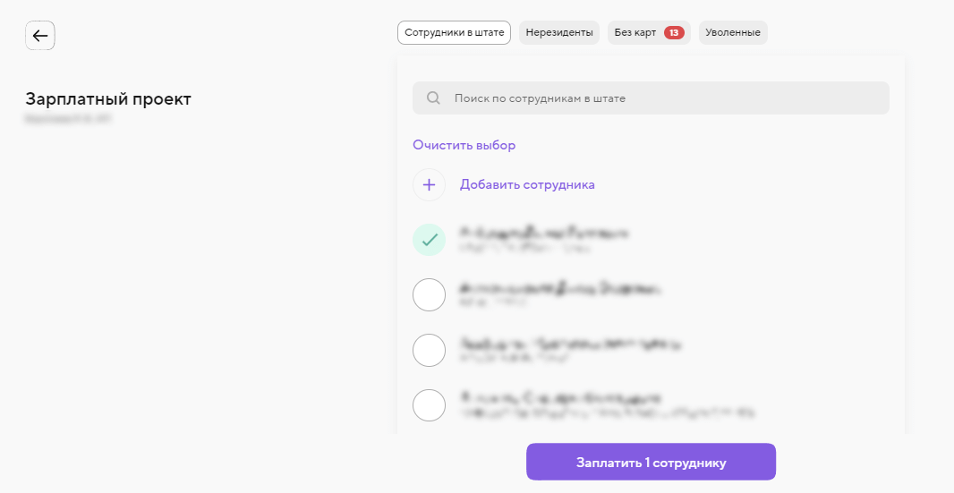 ШАГ 1. В интернет-банке перейдите в Зарплатный проект и отметьте сотрудников, которым нужно выплатить зарплату.