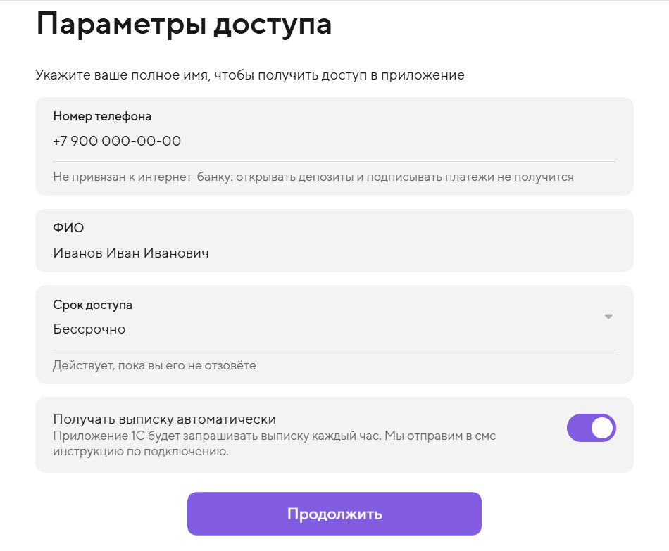 4. Перейдите к Параметрам доступа, подключите пункт «Получать выписку автоматически», нажмите «Продолжить» и сохраните.