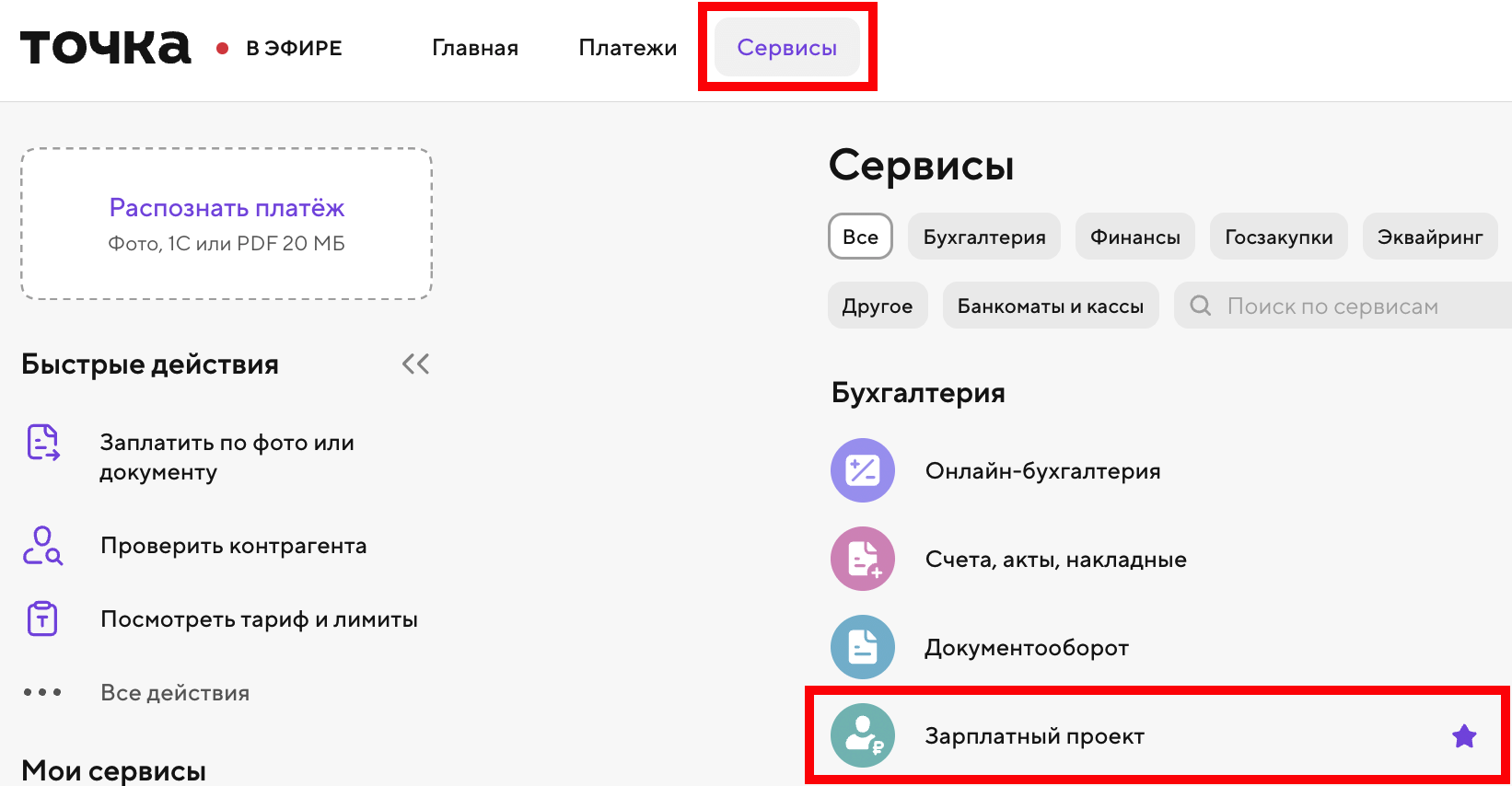 2. Перед установкой скачайте файл с обработкой. На главной странице интернет-банка выберите «Сервисы» — «Бухгалтерия» — «Зарплатный проект».