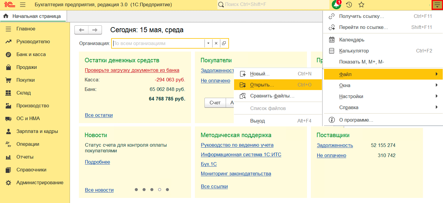 После скачивания файла распакуйте его из архива. В 1С перейдите в верхнее меню справа, выберите «Файл» — «Открыть».