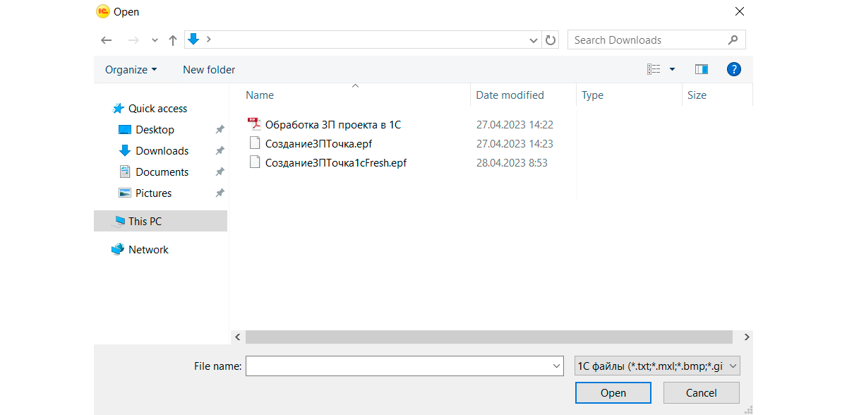 Появится окно, в котором нужно найти файл обработки в формате EPF. Он называется «СозданиеЗПТочка.epf» или «СозданиеЗПТочка1cFresh.epf». После этого нажмите «Открыть» — появится окно для создания зарплатного проекта.