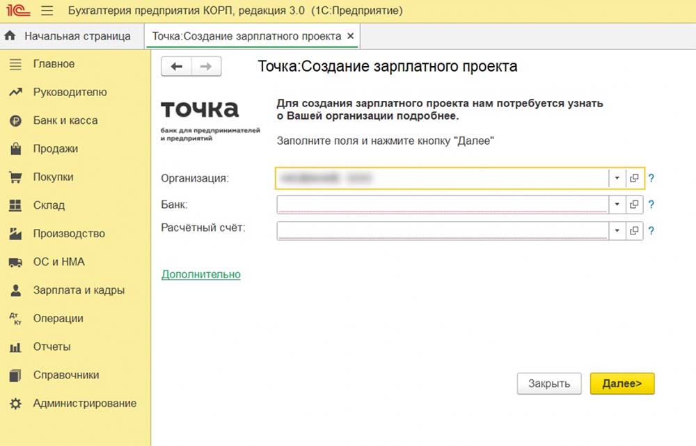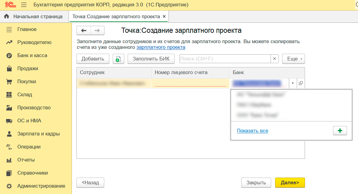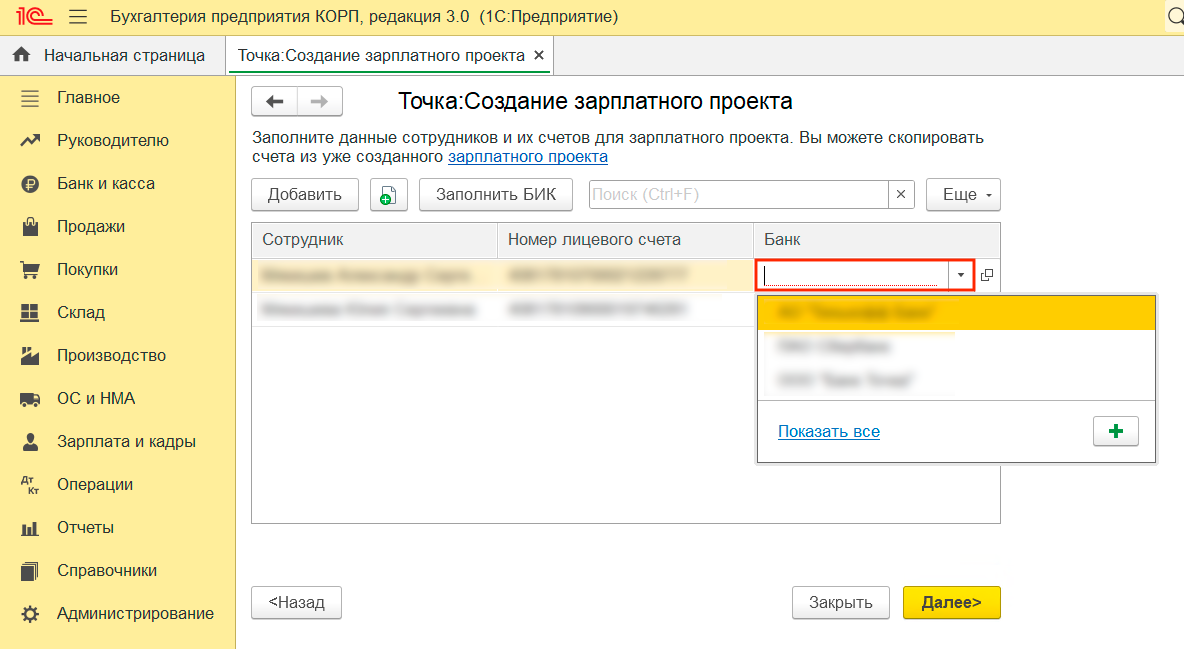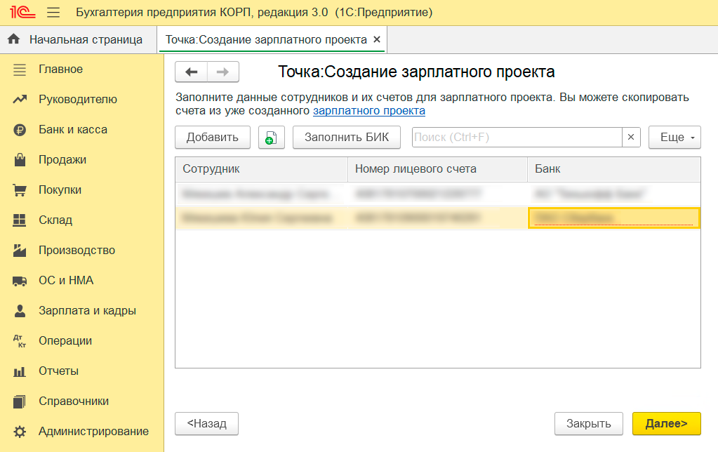 Не волнуйтесь, если у зарплатного проекта будет БИК Точки, а у сотрудников — БИК других банков. Так работает 1С. Например, при редактировании данных сотрудника может появиться предупреждение, что БИК не совпадает — это не будет ошибкой.