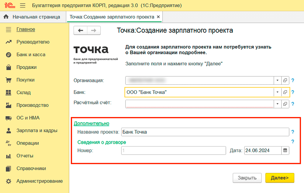 Укажите дополнительные параметры: название зарплатного проекта и сведения о договоре. Введите любой номер и любую дату, например, договор №1 от 01.01.2024. В Точке зарплатному проекту эти данные не присваиваются. Нажмите «Далее».