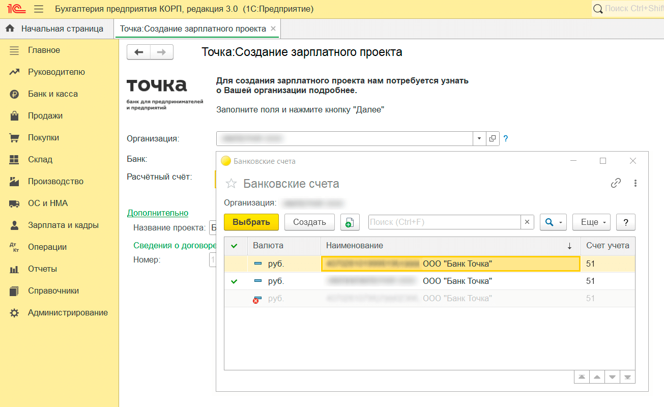 Выберите организацию и банк из списка сохранённых. Номер счёта для зарплатного проекта нужно заполнить вручную.
