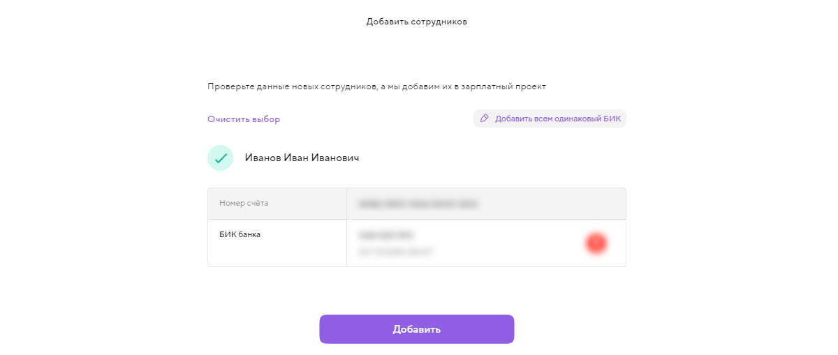 Обратите внимание: если при импорте счёт не совпадёт с БИК банка вашего зарплатного проекта, из которого копируется список, банк нужно будет указать вручную.