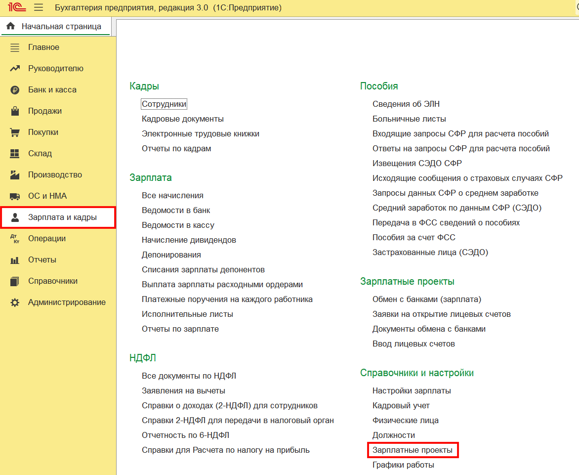 - создать зарплатный проект в 1С;