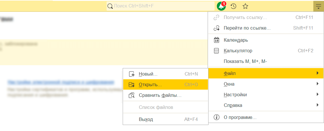 После скачивания файла распакуйте его из архива. Откройте в 1С правое верхнее меню, выберите «Файл» — «Открыть».