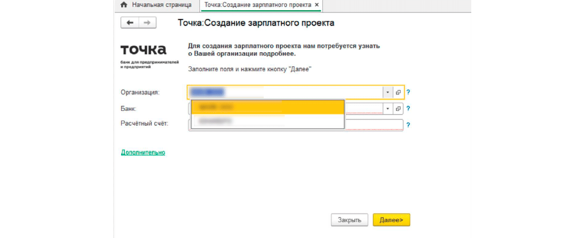Выберите организацию и банк из списка сохранённых. Номер счёта для зарплатного проекта нужно заполнить вручную.