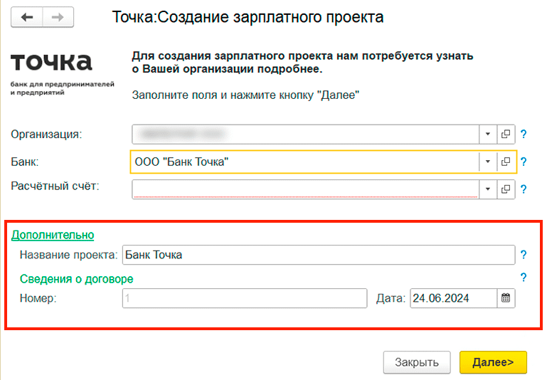 Укажите дополнительные параметры: название зарплатного проекта и сведения о договоре. Введите любой номер и любую дату, например, договор №1 от 01.01.2024. В Точке зарплатному проекту эти данные не присваиваются. Нажмите «Далее».