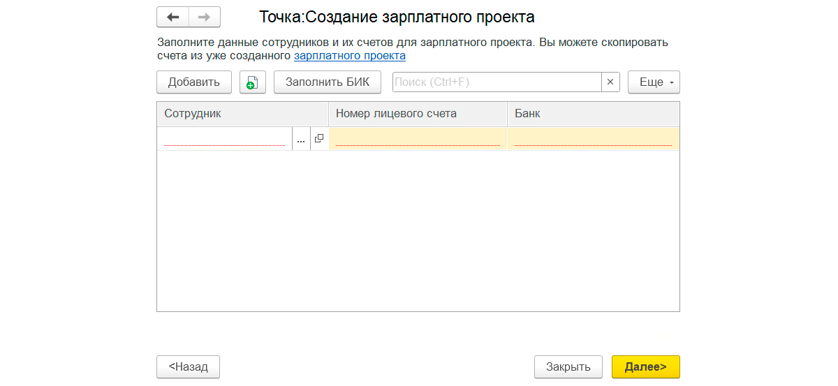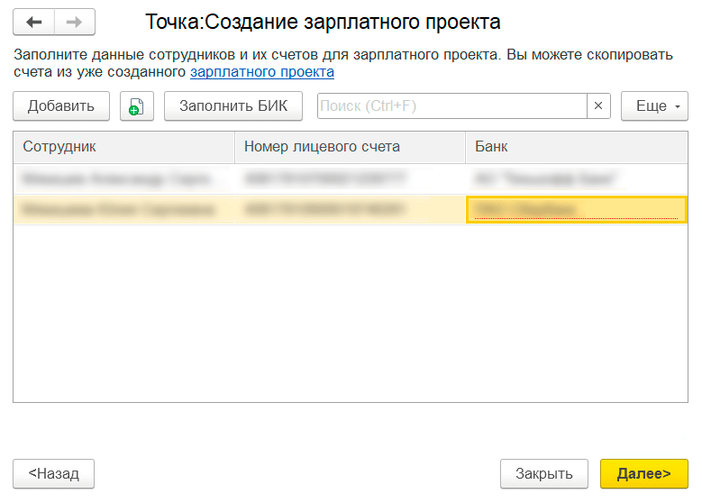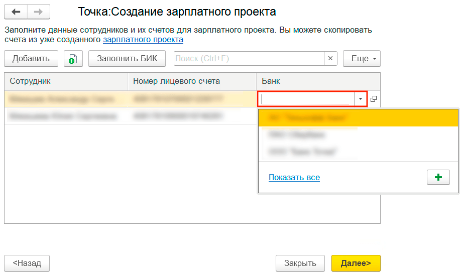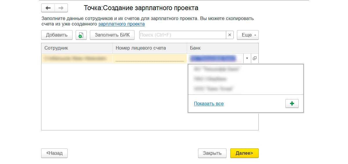 Не волнуйтесь, если у зарплатного проекта будет БИК Точки, а у сотрудников — БИК других банков. Так работает 1С. Например, при редактировании данных сотрудника может появиться предупреждение, что БИК не совпадает — это не будет ошибкой.