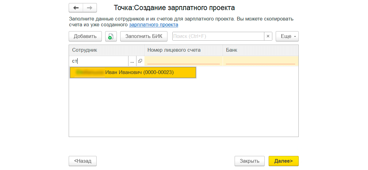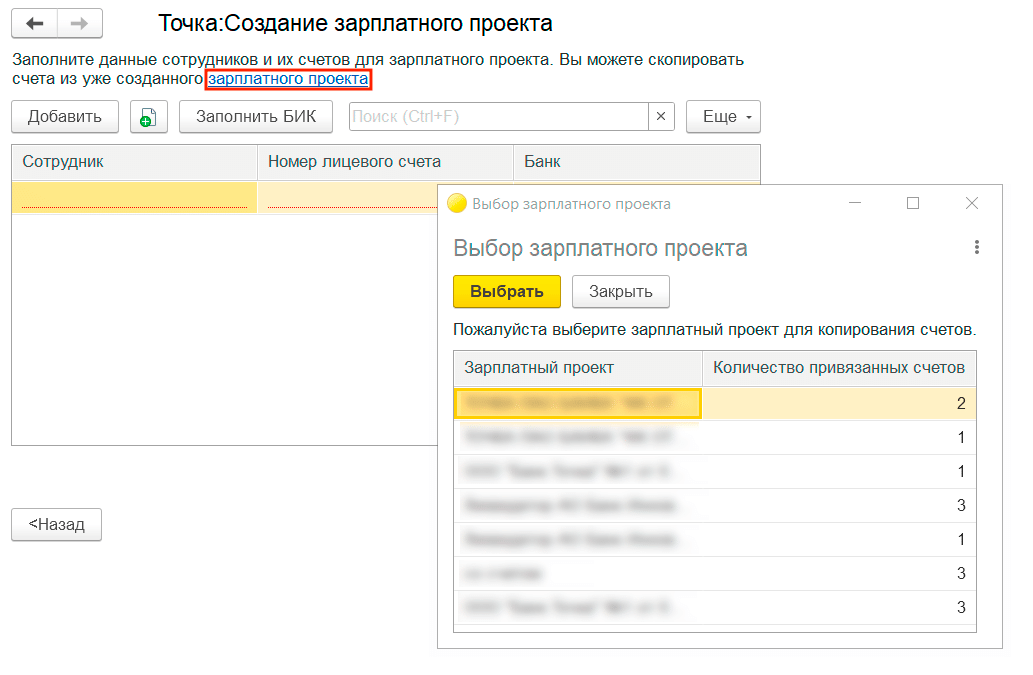 Если при импорте счёт не совпадёт с БИК банка вашего зарплатного проекта, из которого копируется список, банк нужно будет указать вручную.