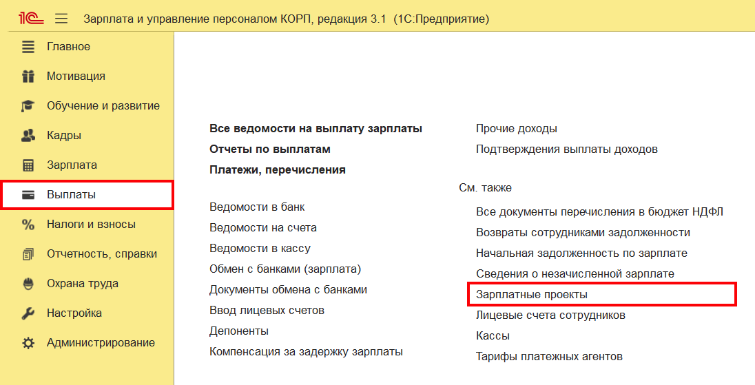 Для этого перейдите в раздел «Выплаты» — «Зарплатные проекты» и выберите созданный зарплатный проект.