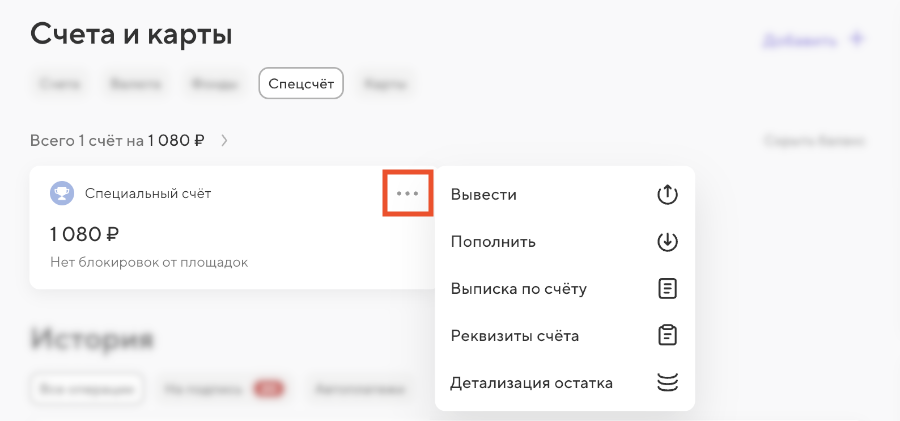 Проще всего пополнить специальный счёт со своего расчётного счёта. Для этого на главной странице в интернет-банке нажмите на спецсчёт — три точки — «Пополнить».