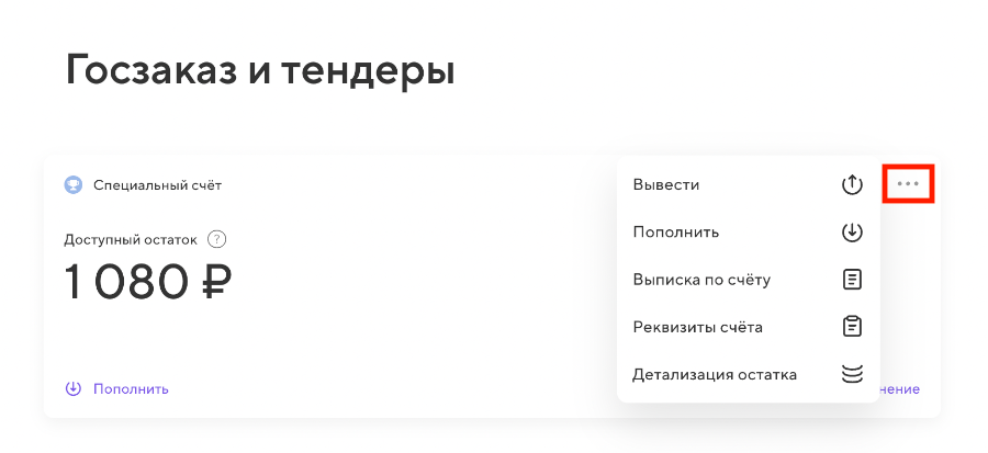 Это также можно сделать разделе «Госзакупки»: нажмите на спецсчёт, далее на кнопку в виде трёх точек, а затем «Вывести».