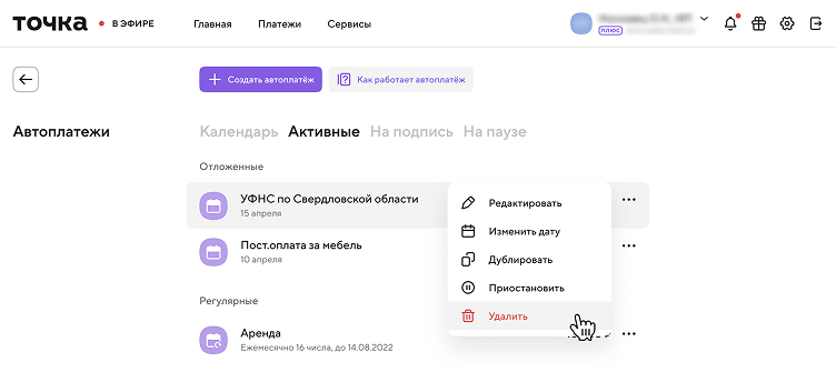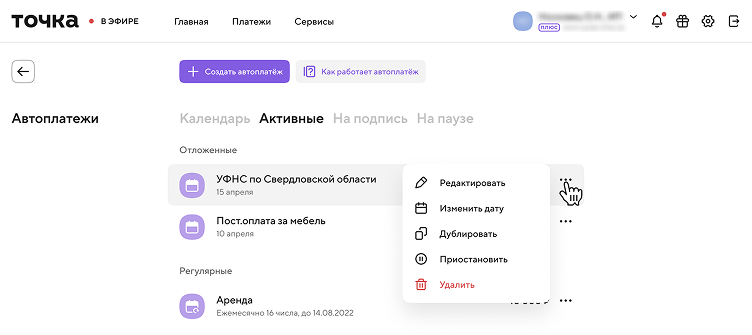 - Откройте список автоплатежей. Для этого перейдите в «Платежи» на главной интернет-банка, выберите вкладку «Автоплатежи» и откройте нужный платёж. Нажмите на три точки рядом с нужным автоплатежом — появится меню с действиями: «Редактировать», «Дублировать», «Приостановить», «Удалить».