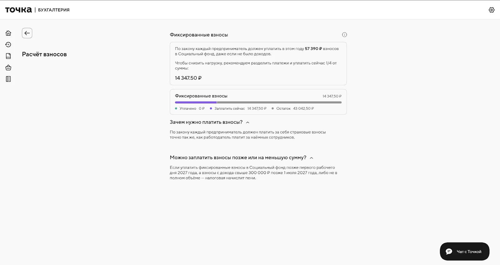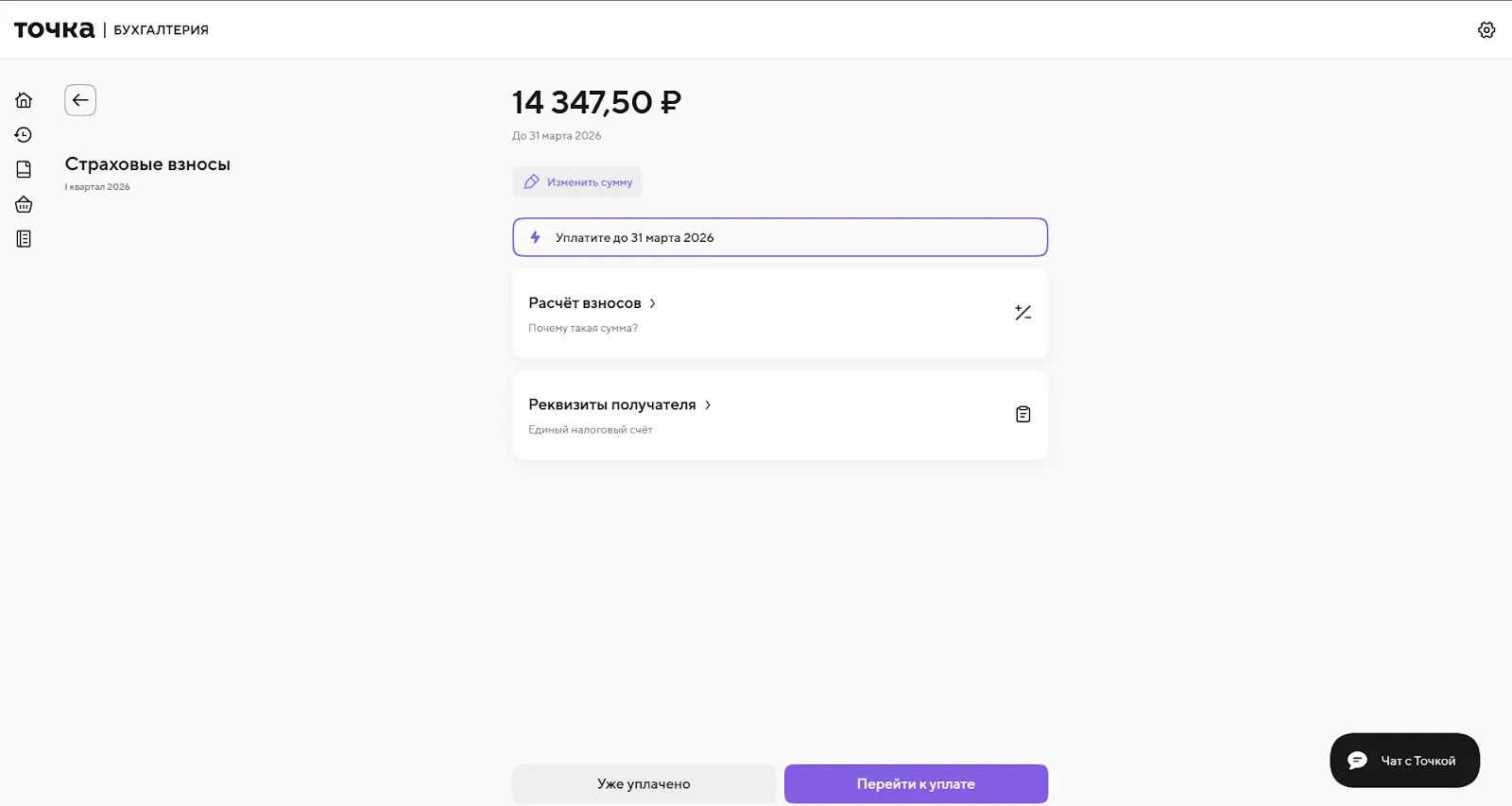 Чтобы посмотреть, как рассчитаны взносы, нажмите на активную задачу по страховым взносам в «Задачах» Бухгалтерии и выберите «Расчёт взносов». Вы увидите, как сервис рассчитал взносы и сколько налога останется уплатить.