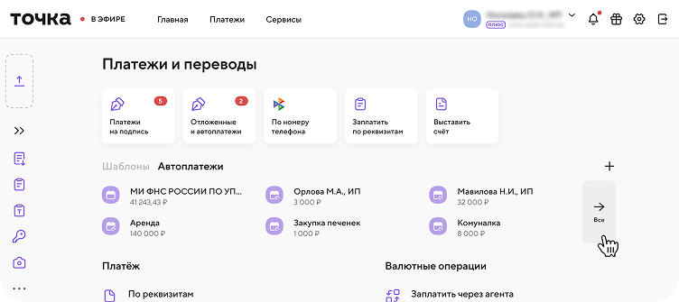 - Откройте список автоплатежей: для этого перейдите в «Платежи» на главной интернет-банка, выберите вкладку «Автоплатежи» и откройте нужный платёж. Если платежей много, нажмите на кнопку «Все».