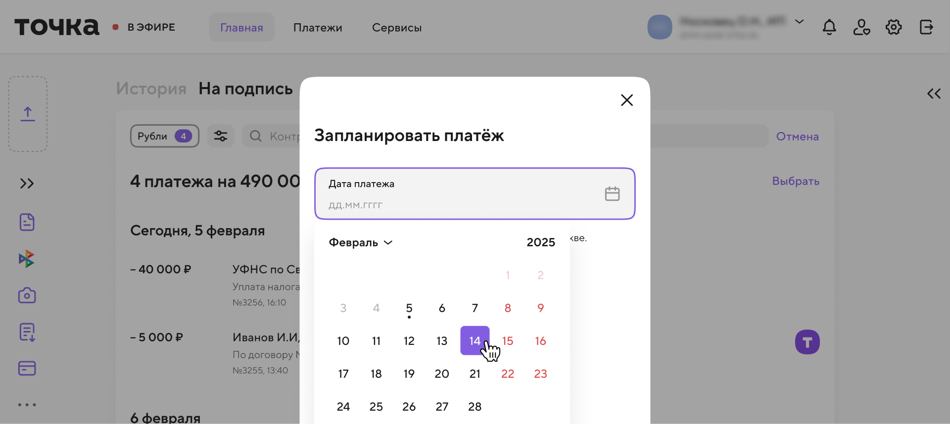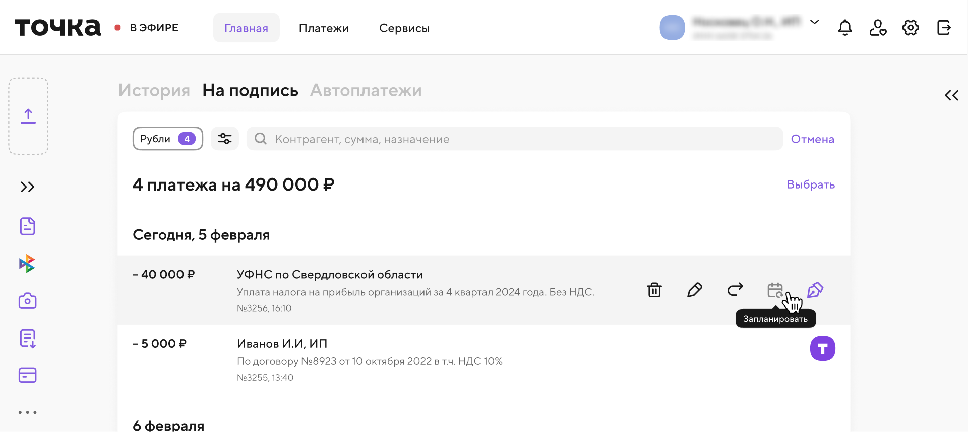 3. Перейдите в раздел «На подпись» и нажмите «Запланировать». Запланировать такой платёж может только распорядитель с правом подписи. Если у вас не хватает прав, попросите директора компании запланировать платёж.