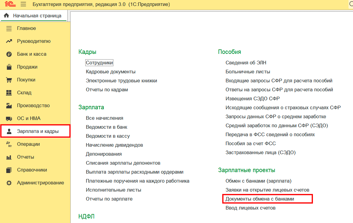 1. Создайте ведомость на выплату зарплаты в 1С. Для этого перейдите в раздел «Зарплата и кадры» — «Зарплатные проекты» — «Документы обмена с банками».