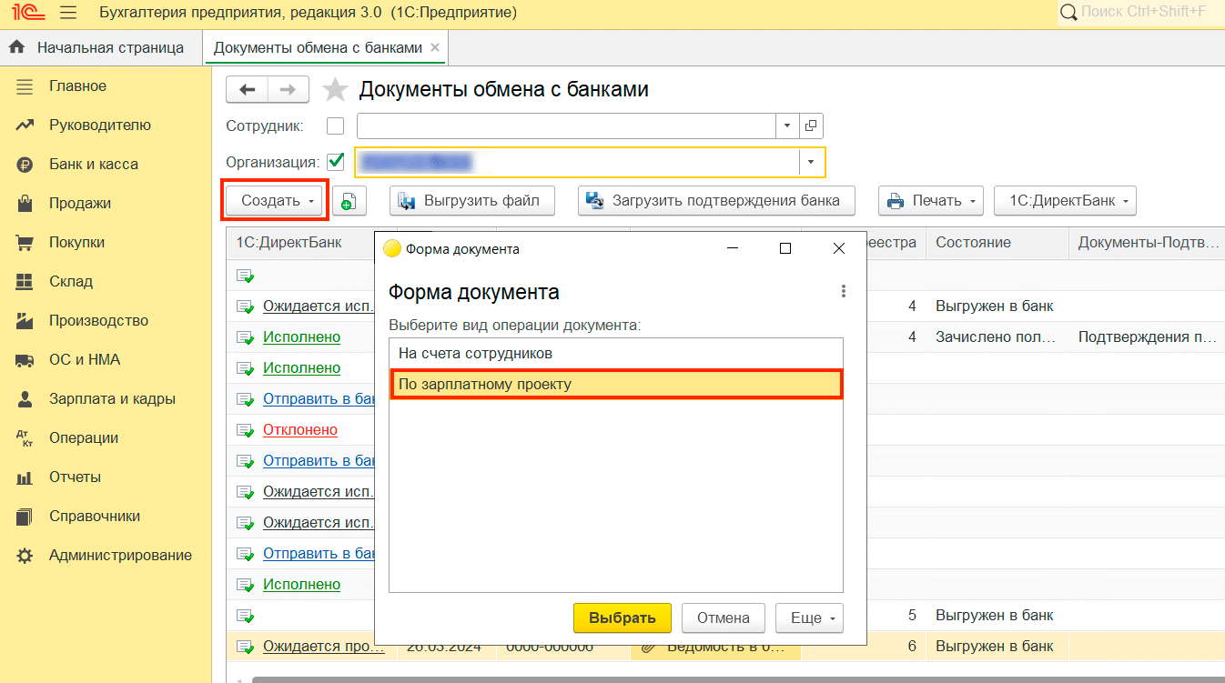 2. Нажмите «Создать» — «Ведомость в банк» — «По зарплатному проекту».