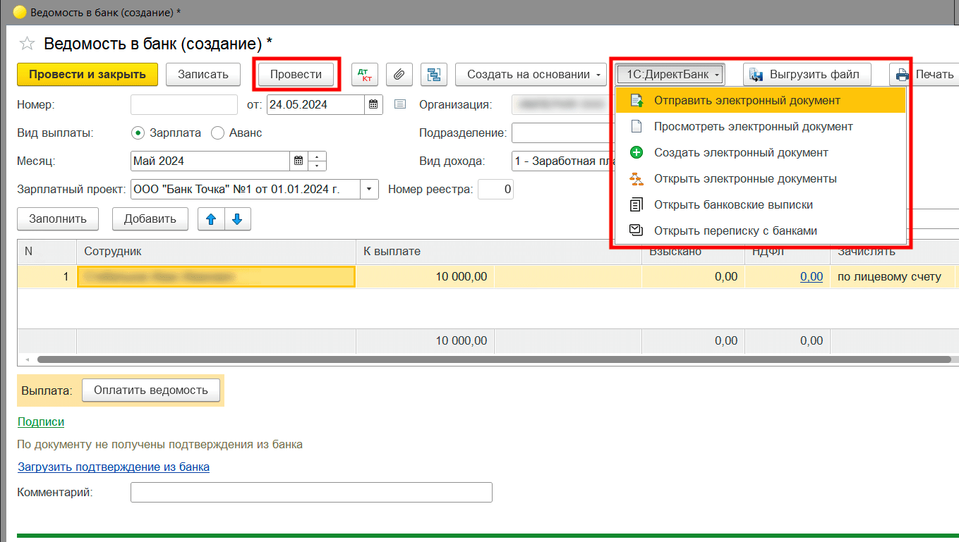 3. После заполнения данных нажмите «Провести» — «1С:ДиректБанк» — «Отправить электронный документ». Ведомость попадёт в Зарплатный проект Точки.