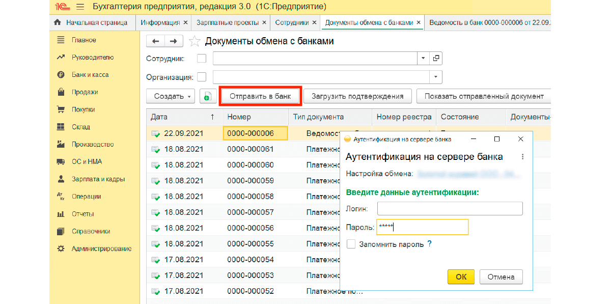 Потом когда захотите отправить документ, зайдите в раздел «Зарплата и кадры» — «Зарплатные проекты» — «Документы обмена с банками», нажмите на нужную ведомость и затем на «Отправить в банк». Ведомости попадут в Зарплатный проект Точки.