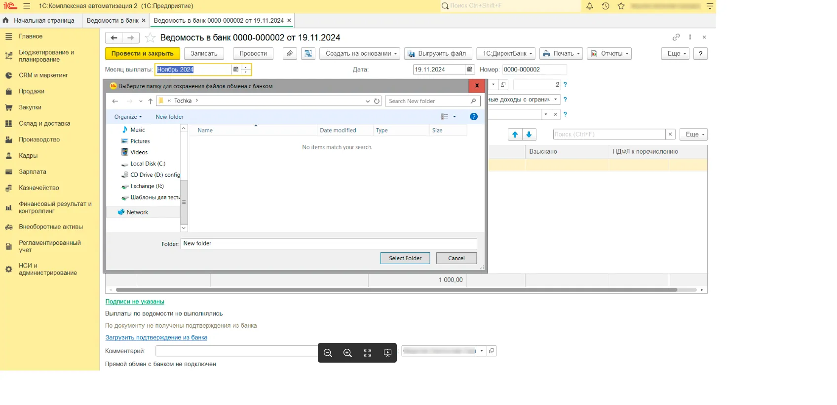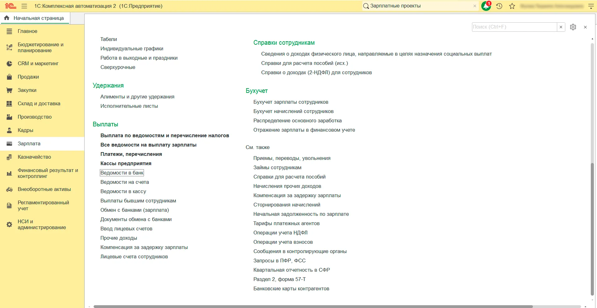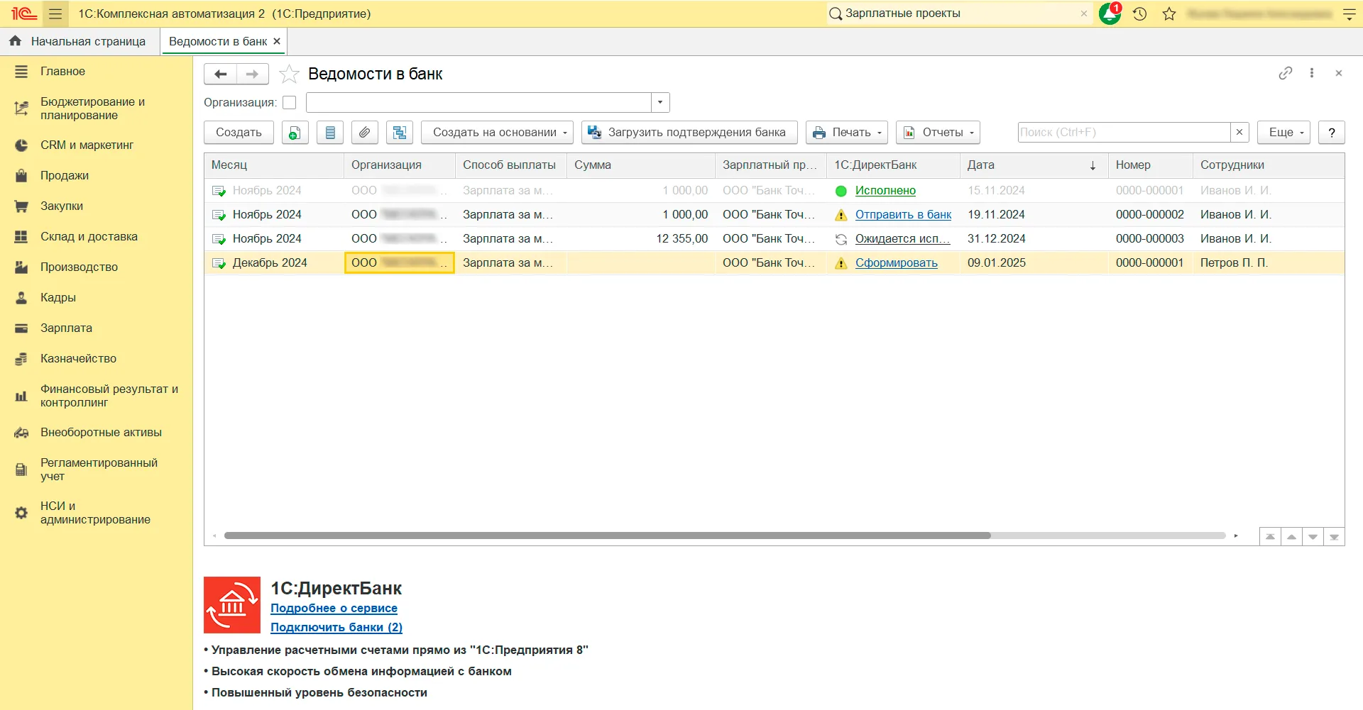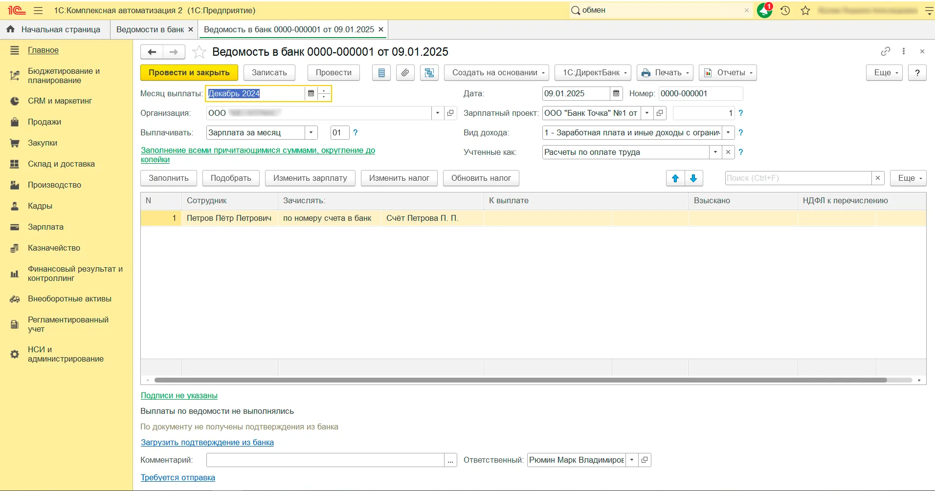1. Создайте ведомость на выплату зарплаты в 1С. Для этого перейдите в раздел «Зарплата» — «Выплаты» — «Ведомости в банк».