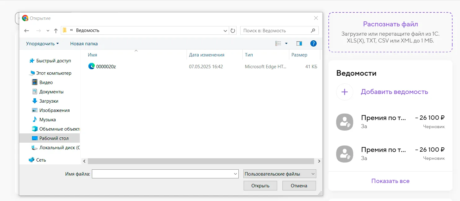 3. Для отправки ведомости нажмите «Выгрузить файл». В появившемся в окне выберите папку и сохраните файл ведомости.