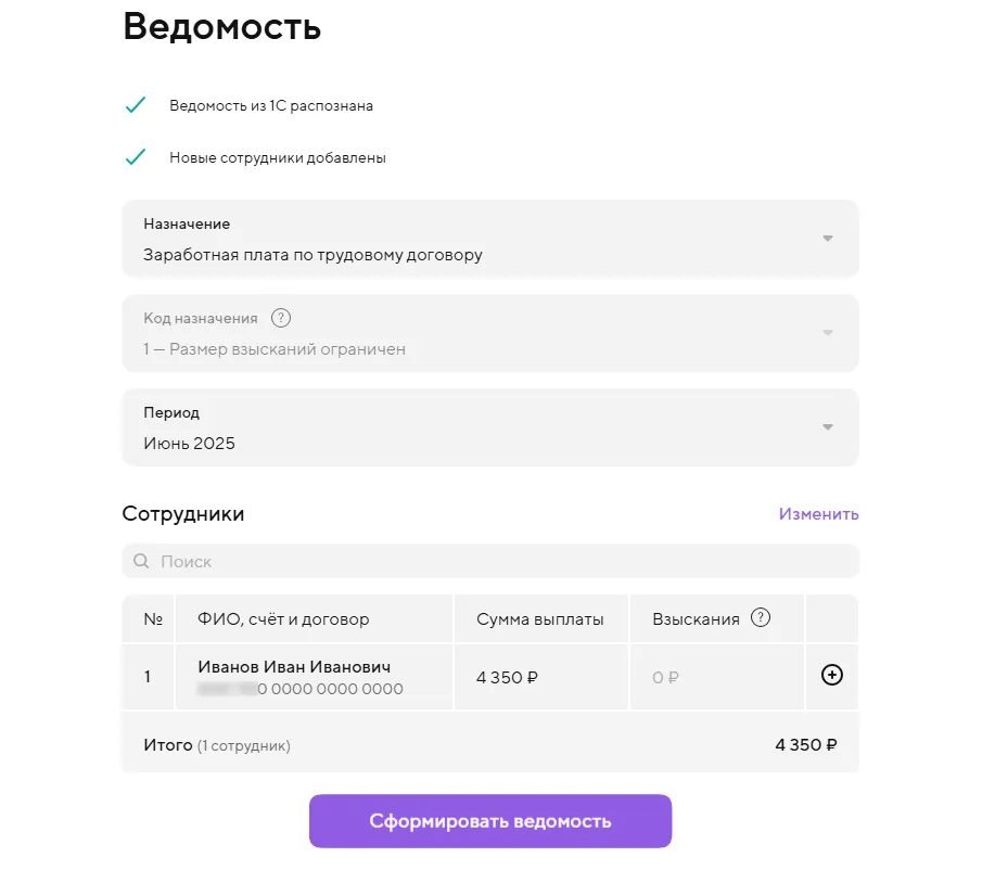 6. Нажмите «Сформировать ведомость», подпишите ведомость или отправьте её на подпись руководителю — документ появится на главной в разделе «Деньги и события» и в Зарплатном проекте.