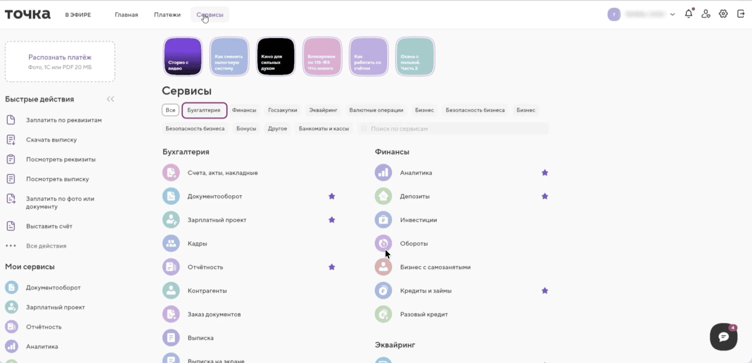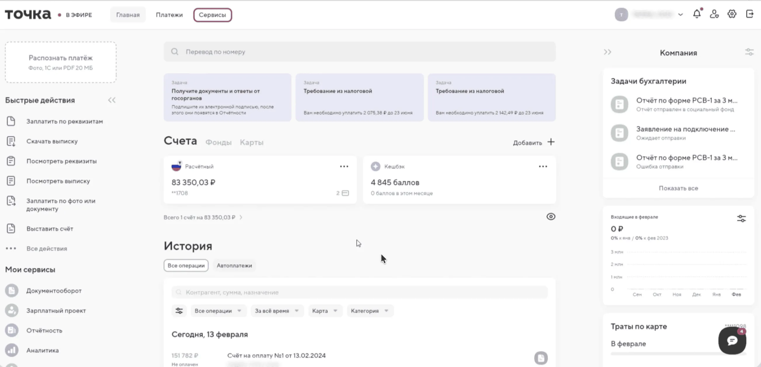 Шаг 1. Авторизуйтесь в личном кабинете Точка Банка. В верхнем меню страницы откройте раздел «Сервисы».