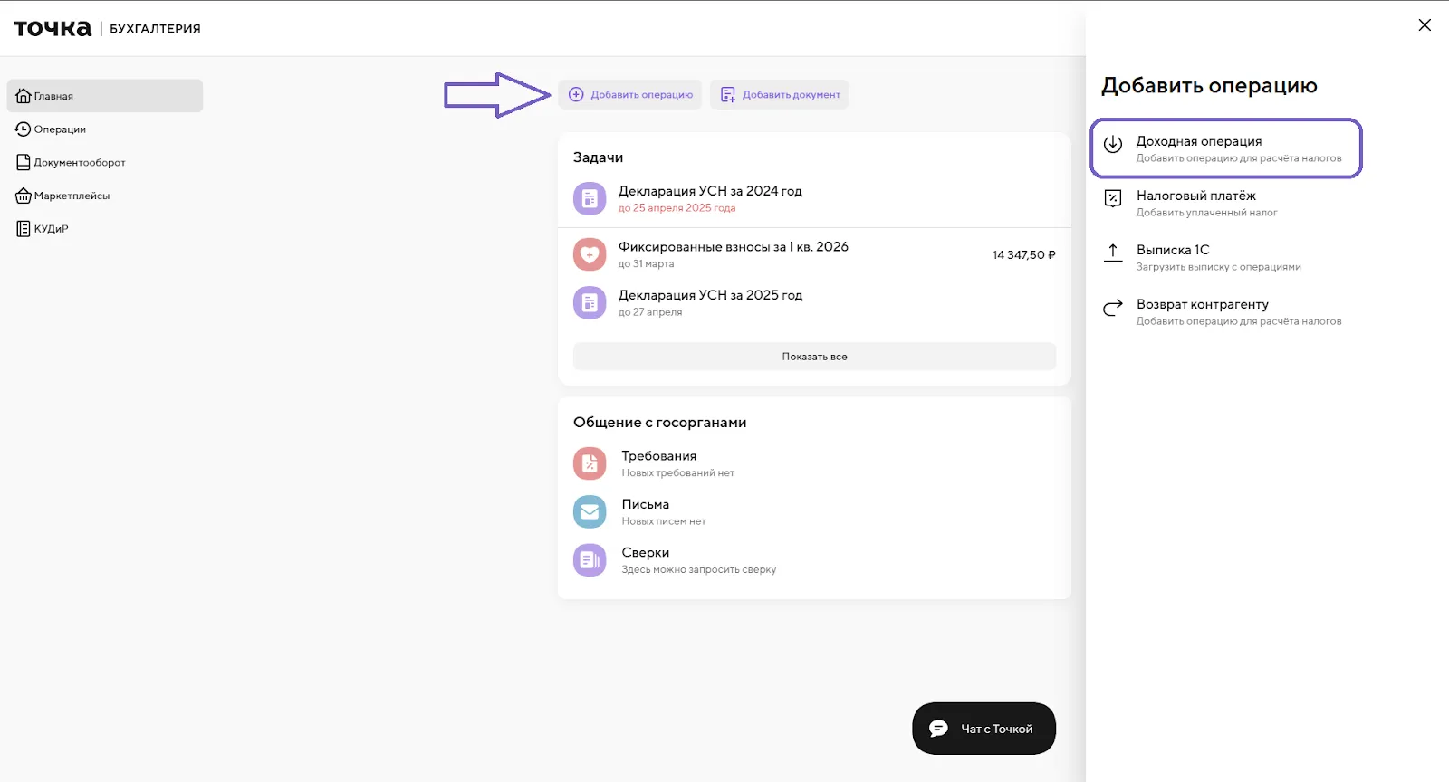 Нажмите «Добавить операцию» и затем «Доходную операцию». В открывшемся окне укажите сумму и название контрагента, дату, назначение платежа и выберите систему налогообложения. Сохраните доход — сервис сразу учтёт его в налогах.