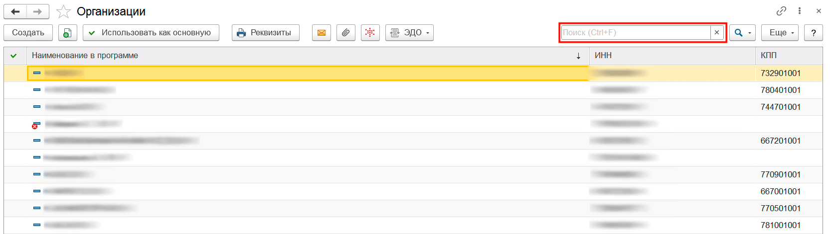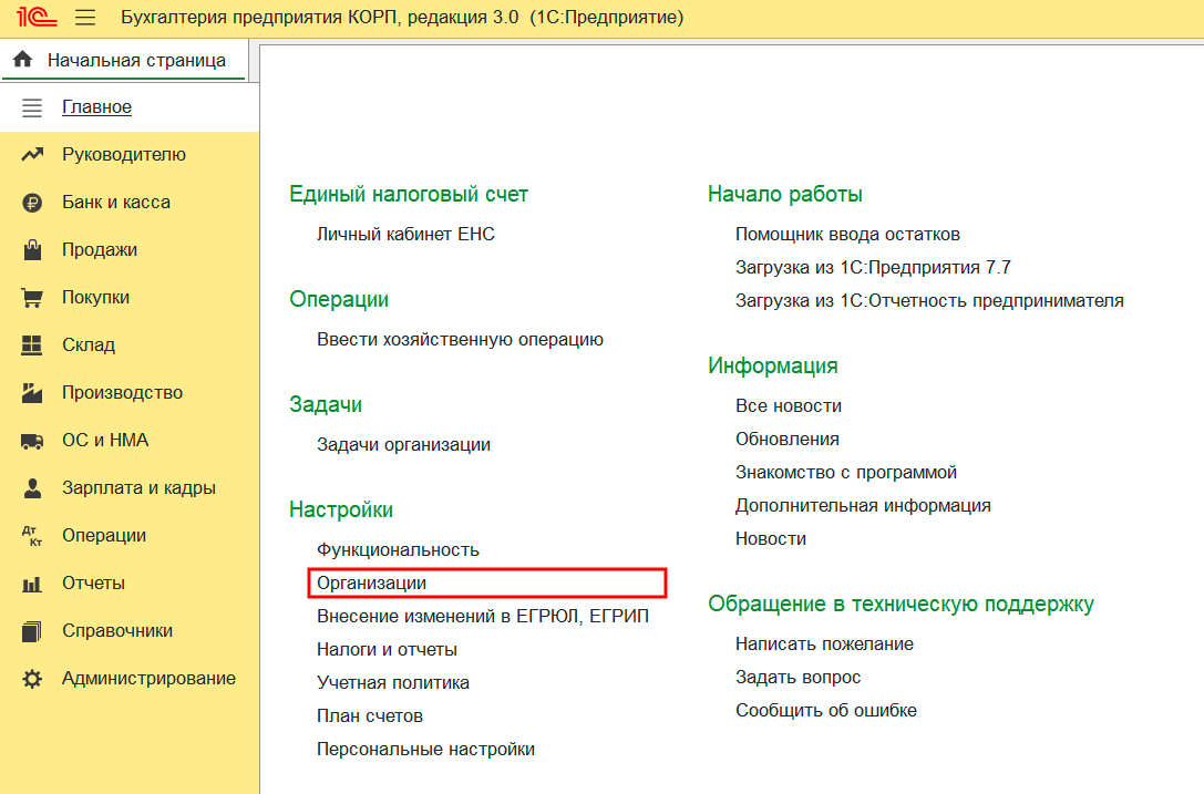 На это у вас уйдёт пара кликов: откройте в 1С меню «Главное» — «Организации».