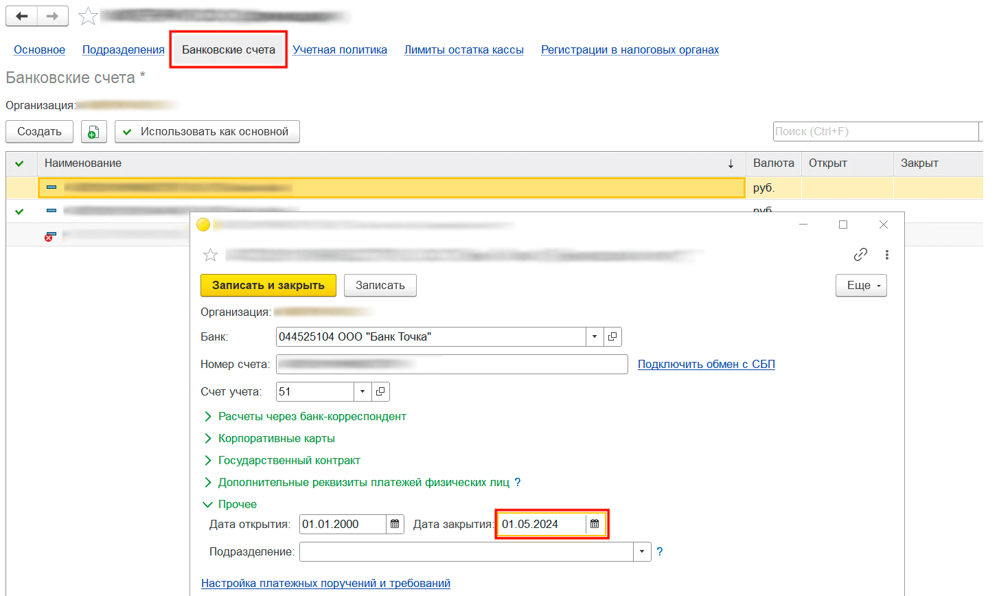 Перейдите на вкладку «Банковские счета». Выберете нужный счёт и укажите дату закрытия — она может быть любой, это ни на что не повлияет. Затем нажмите «Записать и закрыть».