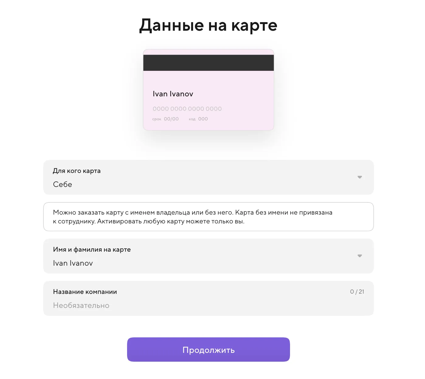 Укажите, кому вы выпускаете карту: себе или другому человеку. Это может быть сотрудник, член семьи и так далее. Для другого человека можно заказать карту с именем владельца на карте или без его указания. Карта без имени владельца не будет привязана к какому-то конкретному человеку, её можно передавать.