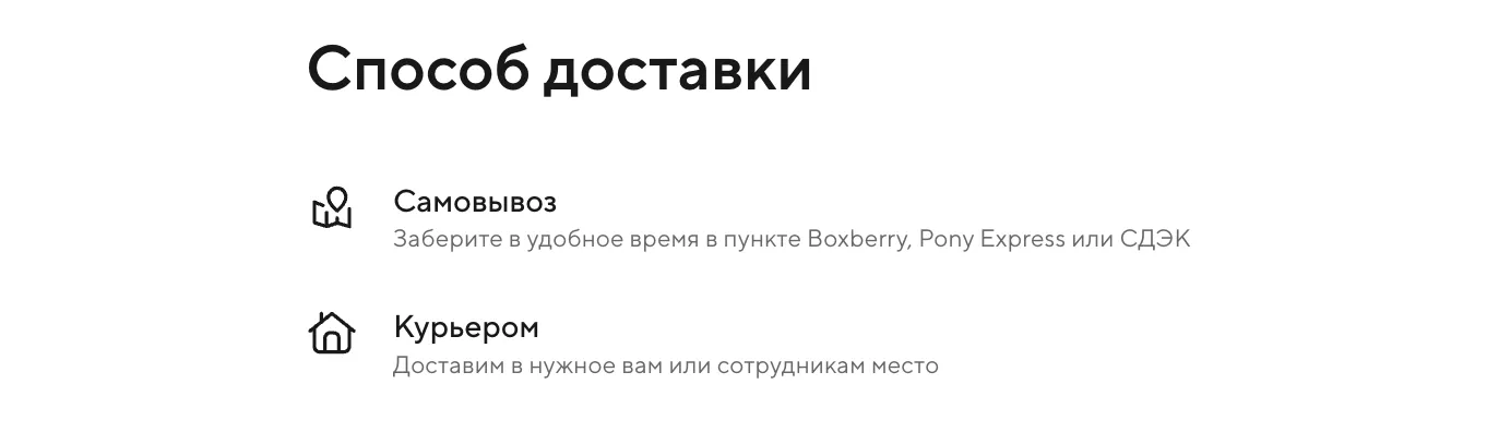 Далее выберите способ доставки: самовывозом или курьером. Вы можете забрать карту в любое удобное для вас время из пункта выдачи СДЭК, Пони Экспресс или Boxberry. Вам придёт сообщение от пункта выдачи, когда карту можно будет забрать.
